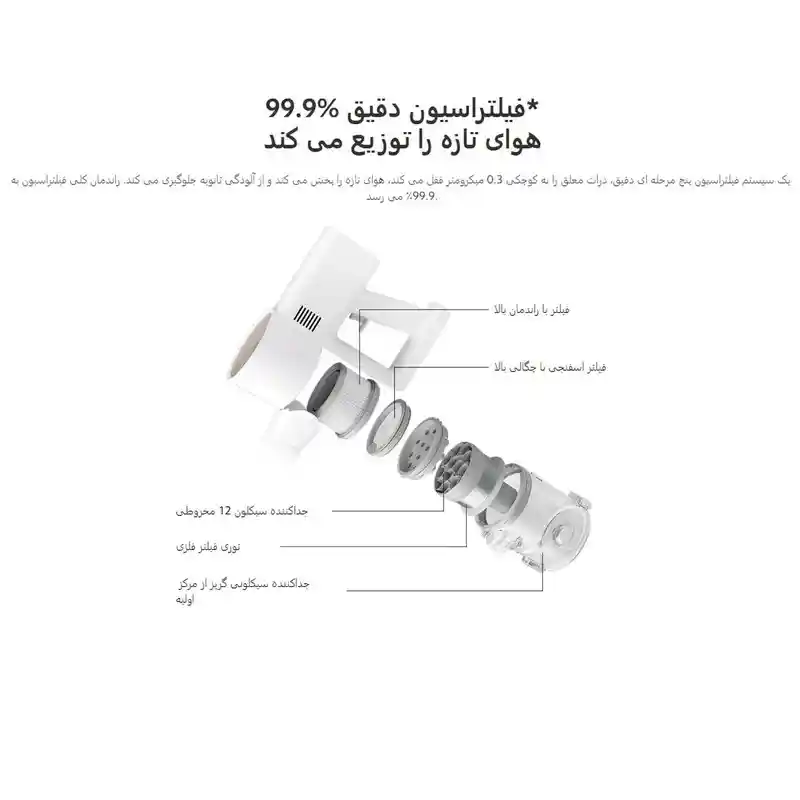 جارو شارژی شیائومی Xiaomi Vacuum Cleaner G20 دارای سیستم فیلتراسیون پنج مرحلهای است که بهطور مؤثر ذرات ریز گرد و غبار و آلایندهها را فیلتر میکند. این سیستم میتواند تا 99.9% ذرات کوچک را از بین ببرد و به تمیزی بیشتر سطوح و محیط کمک کند.