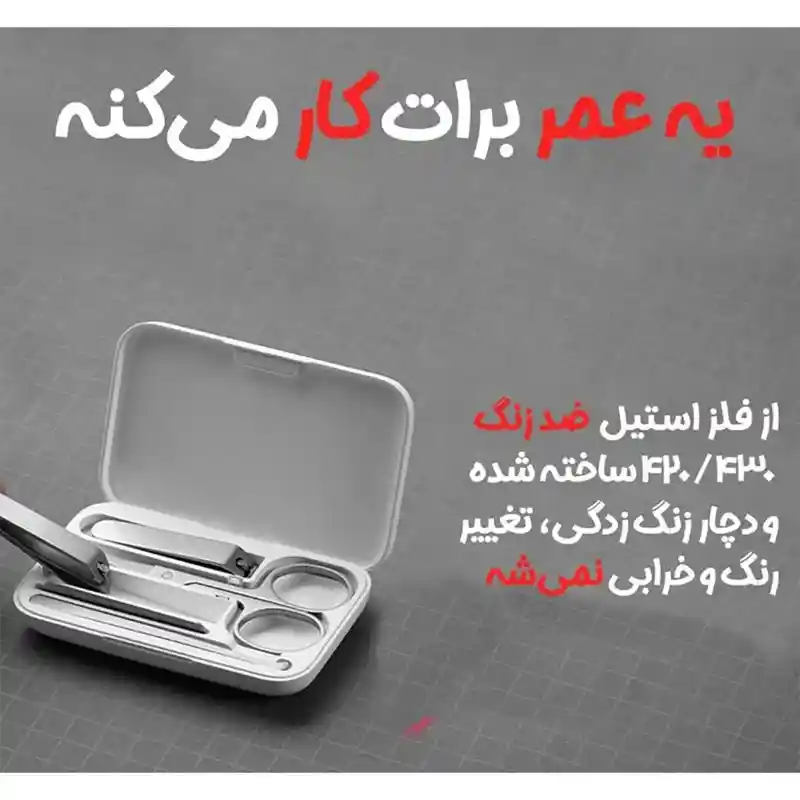 در نگاه اول، یک باکس 65*104*17.3 میلی متری با طراحی مینیمالیستی میبینیم که پس از باز کردن آن 7 ابزار کاربردی برای اصلاح ناخن وجود دارد. با توجه به وزن 104 گرمی و ساختار کوچکی که دارد، یک گزینه مناسب برای حمل روزانه داخل کیف به حساب میآید. خوشبختانه کلیه ابزارهای داخل باکس از استیل ضد زنگ 420/430 ساخته شده اند که دارای استحکام بالا بوده و در استفاده طولانی مدت به هیچ عنوان تغییر رنگ نمیدهد.