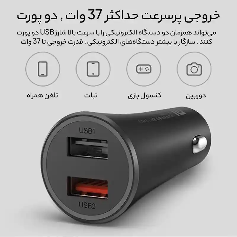 شارژر فندکی شیاومی مدل Mi 37w dual-port car charger دارای دو خروجی USB با توان شارژ دهی 37w می باشد که قابلیت شارژ کردن انواع گوشی تلفن همراه که دارای تکنولوژی شارژ سریع را می باشند را دارد